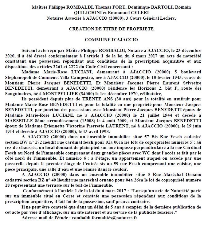 Avis de création de titre de propriété-Commune d'Ajaccio (Corse-du Sud)