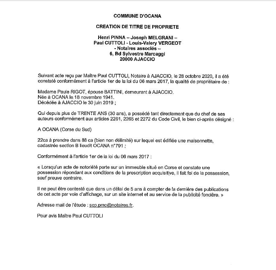Avis de création de titre de propriété-Commune d'Ocana- (Corse du Sud)