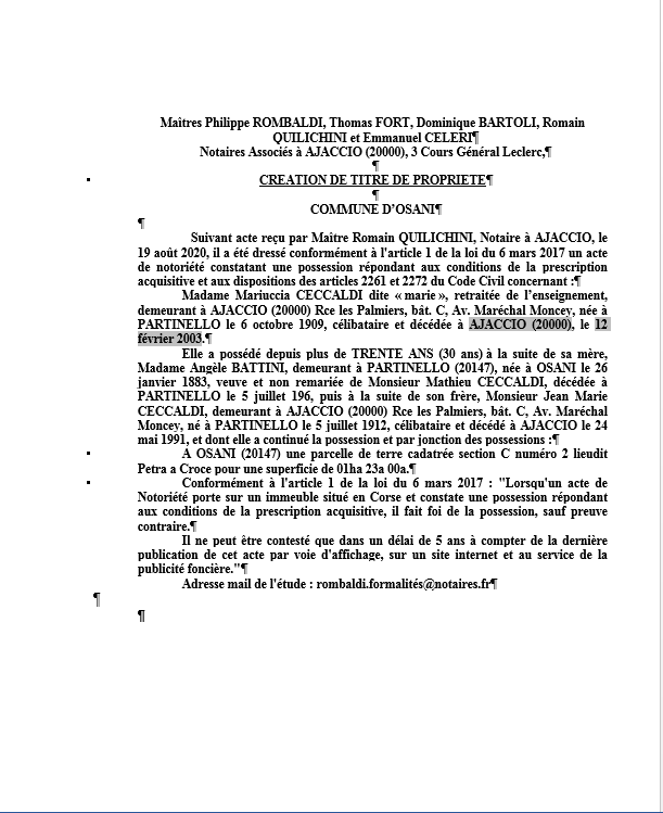 Avis de création de titre de propriété - Commune d'Osani (Corse du Sud)