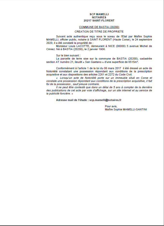 Avis de création de titre de propriété-Commune de Bastia (Haute-Corse)
