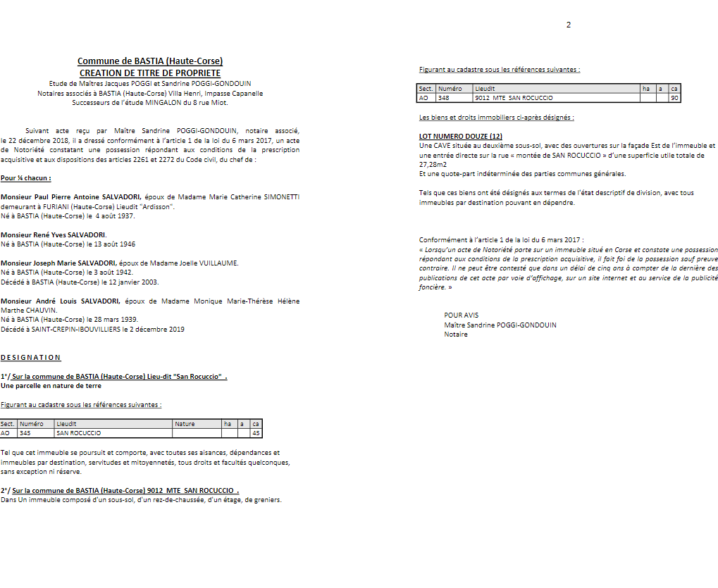 Avis de création de titre de propriété-Commune de Bastia (Haute-Corse)