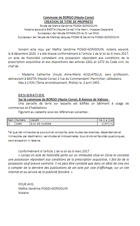 Avis de création de titre de propriété-Commune de Borgo (Haute-Corse)