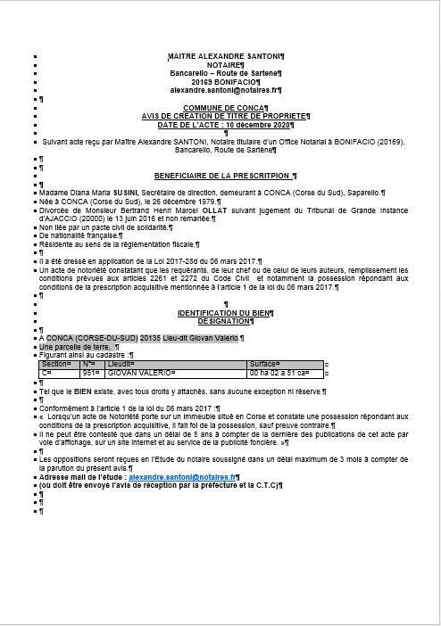 Avis de création de titre de propriété-Commune de Conca (Corse-du Sud)