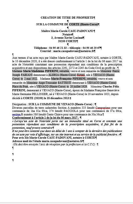 Avis de création de titre de propriété-Commune de Corté (Haute-Corse)