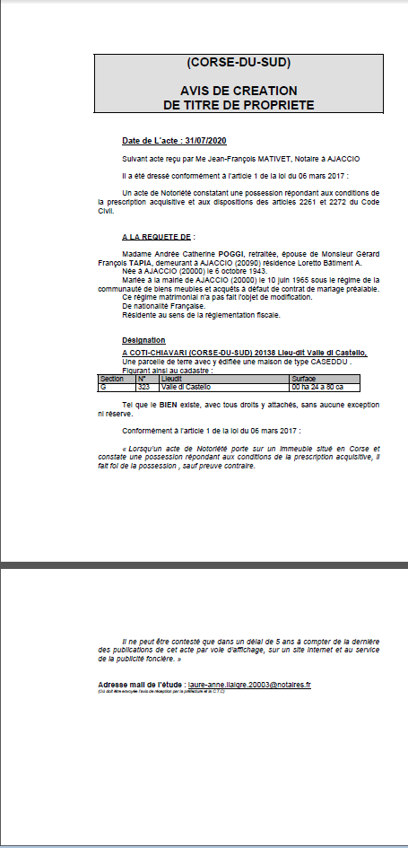 Avis de création de titre de propriété - Commune de Coti-Chiavari (Corse du Sud))