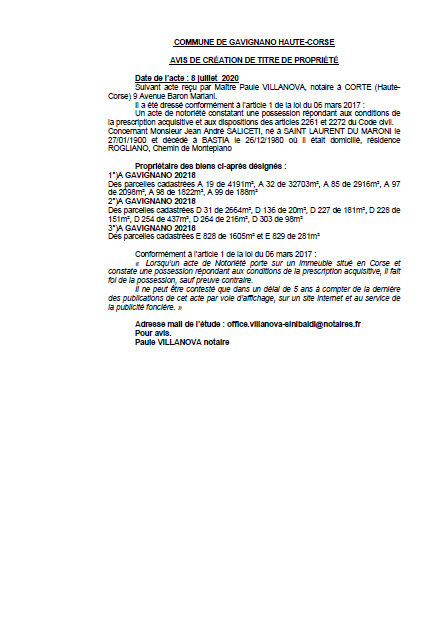 Avis de création de titre de propriété - Commune de Gavignano (Haute-Corse)
