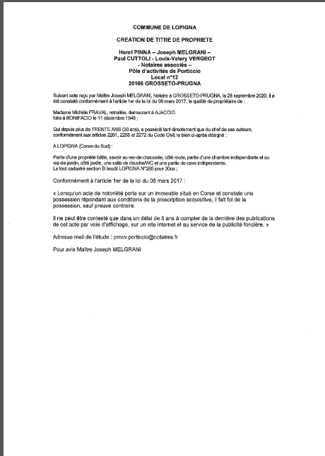 Avis de création de titre de propriété-Commune de Lopigna (Corse-du-Sud)