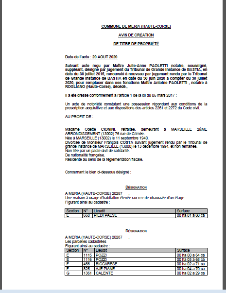 Avis de création de titre de propriété-Commune de Meria (Haute-Corse)
