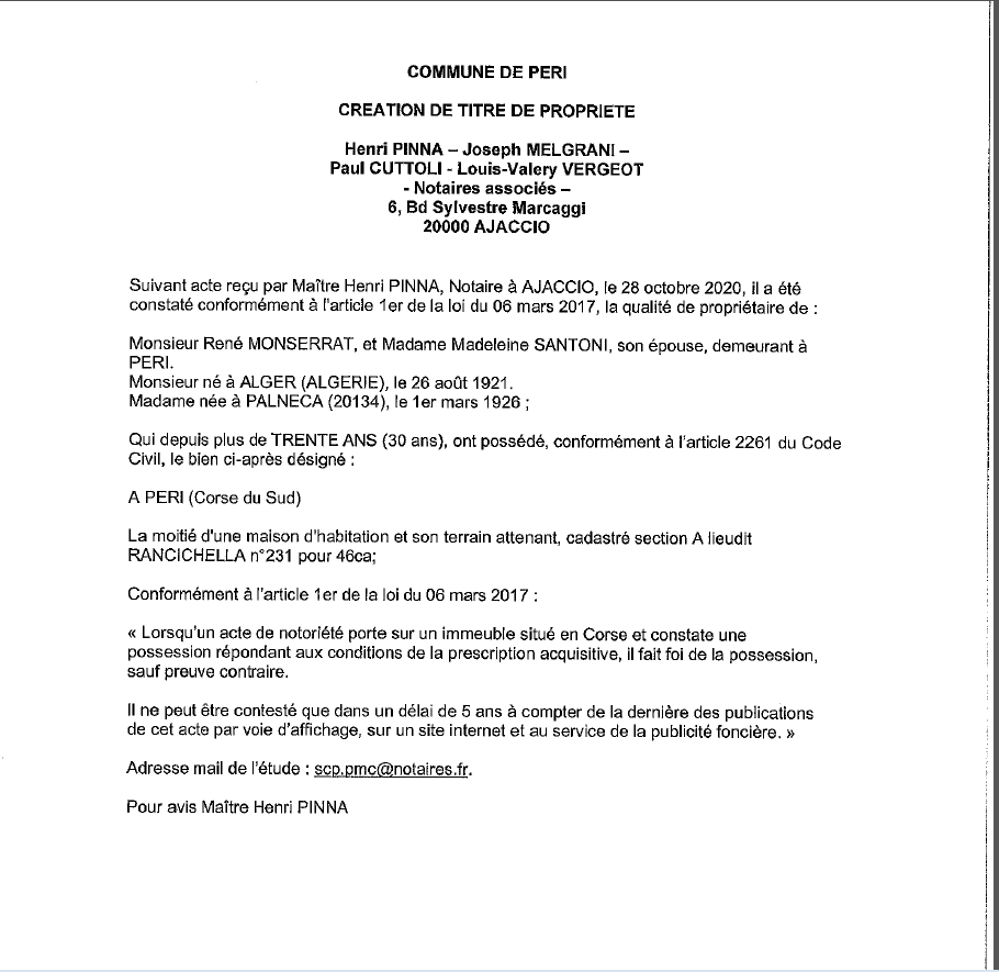 Avis de création de titre de propriété-Commune de Peri- (Corse du Sud)