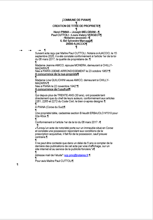 Avis de création de titre de propriété-Commune de Piana (Corse-du-Sud)