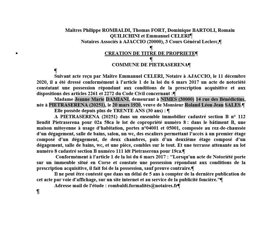 Avis de création de titre de propriété-Commune de Pietraserena ( Corse-du-Sud)