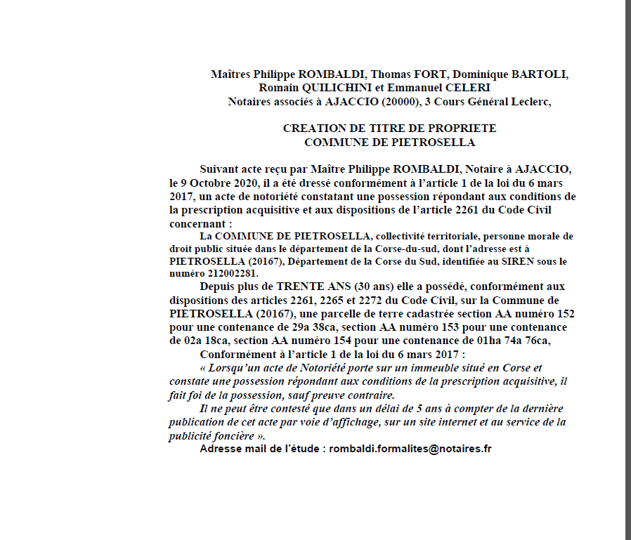 Avis de création de titre de propriété-Commune de Pietrosella- (Corse du Sud)
