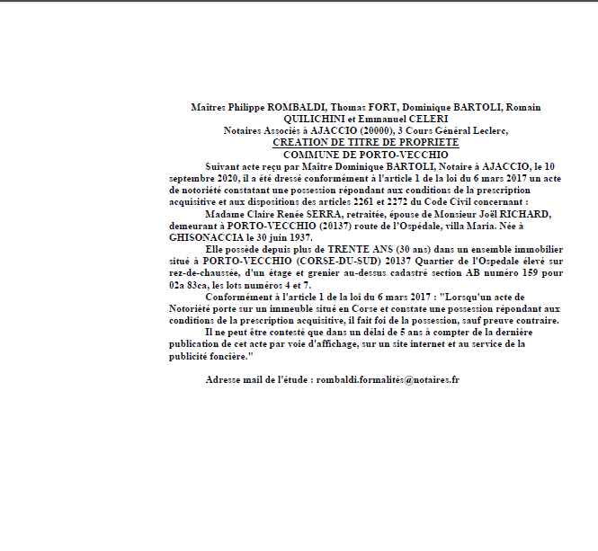 Avis de création de titre de propriété-Commune de Porto-Vecchio (Corse-du-Sud)