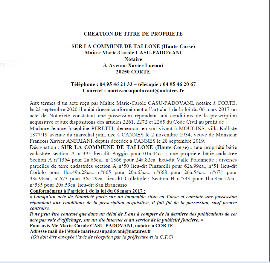 Avis de création de titre de propriété-Commune de Tallone- (Haute-Corse)