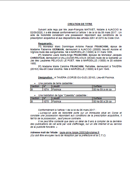 Avis de création de titre de propriété-Commune de Tavera (Corse-du-Sud)