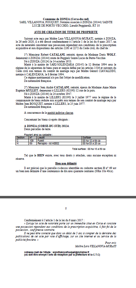 Avis de création de titre de propriété - Commune de Zonza ( Corse du Sud)