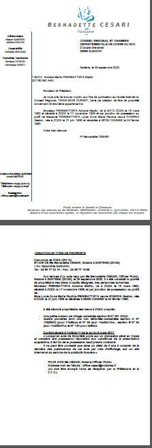 Avis de création de titre de propriété-Commune de Zoza (Corse-du-Sud)
