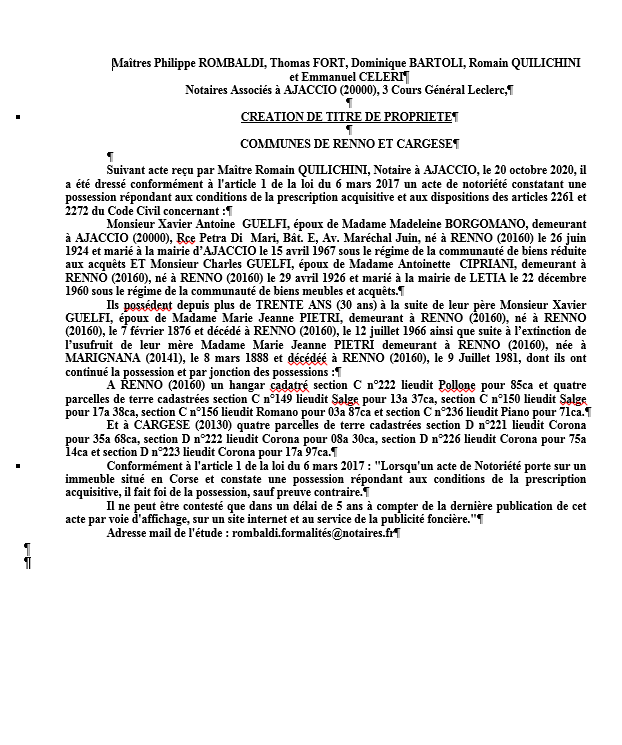Avis de création de titre de propriété-Communes de Renno et Cargese-(Corse du Sud)