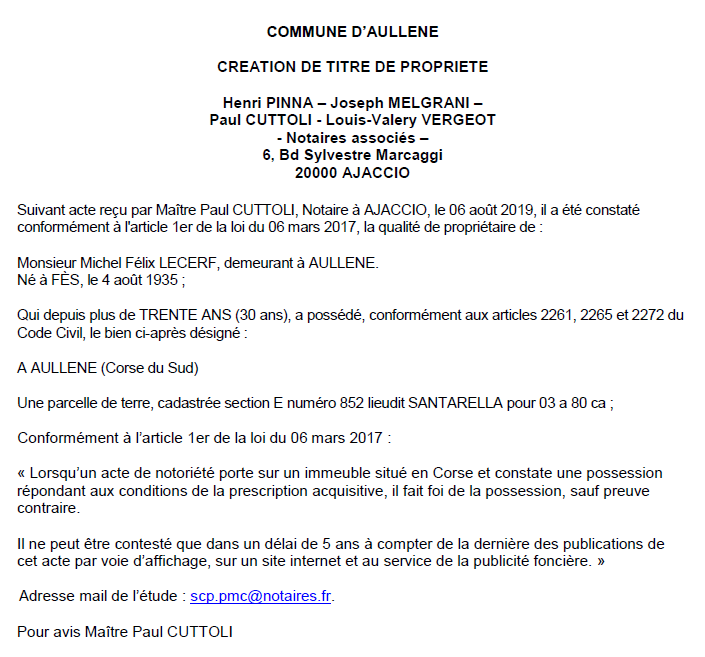 Avis de création de titre de propriété - commune d'Aullène (Corse-du-Sud)