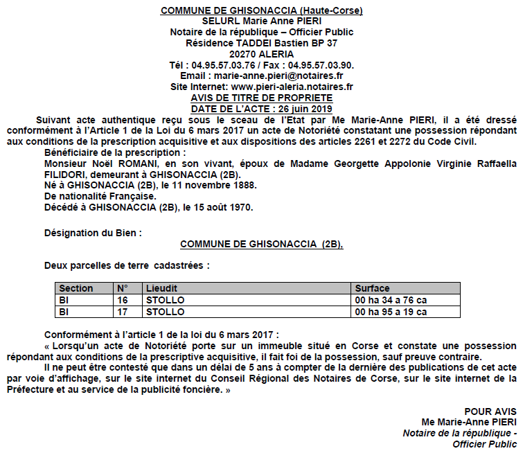 Avis de création de titre de propriété - commune de Ghisonaccia (Haute-Corse)