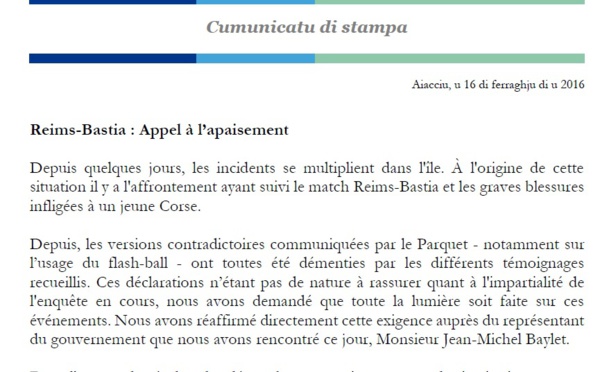 CP - REIMS-BASTIA : APPEL À L’APAISEMENT - 16/02/2016
