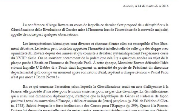La conférence d’Ange Rovere au cours de laquelle ce dernier s’est proposé de « démythifier » la Giustificazione delle Rivoluzione di Corsica mise à l’honneur lors de l’investiture de la nouvelle...