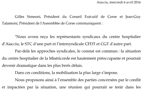 Communiqué de presse des Présidents du Conseil Exécutif de Corse et de l’Assemblée de Corse. Nous avons reçu les représentants syndicaux du centre hospitalier d’Aiacciu, le STC d’une part et...