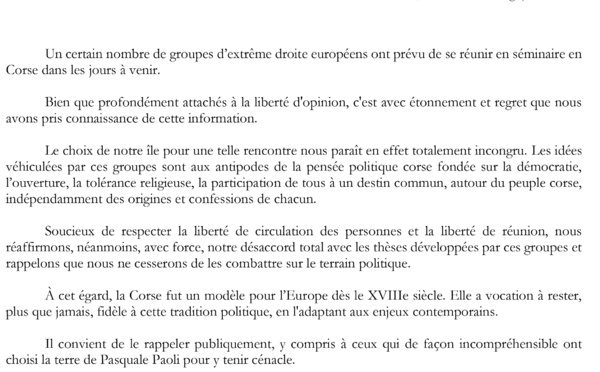 Communiqué commun du Président de l'Assemblée de Corse et du Président du Conseil Exécutif de Corse. Un certain nombre de groupes d’extrême droite européens ont prévu de se réunir en séminaire en...