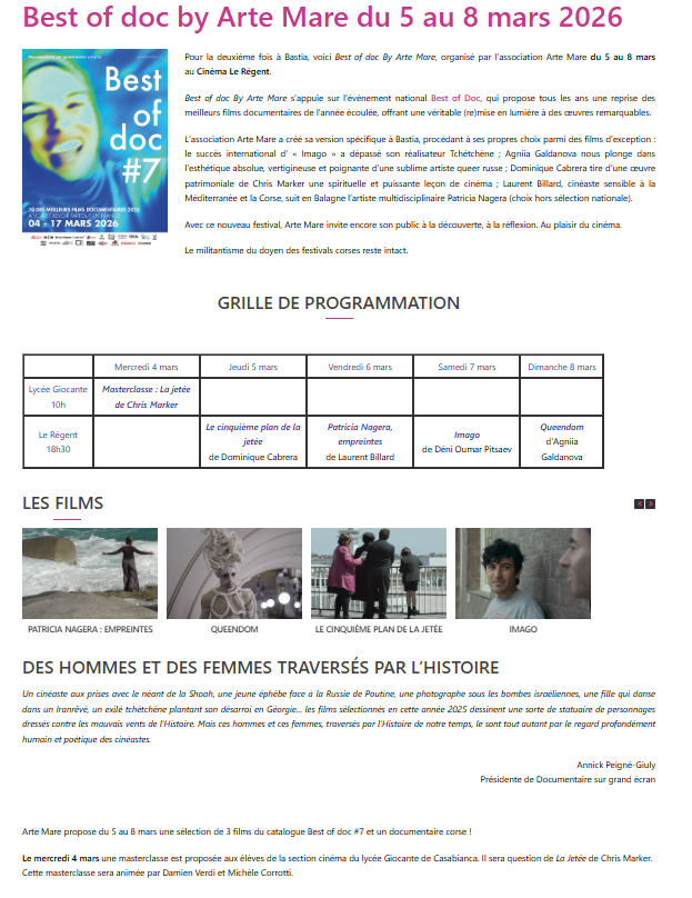 L’association Arte Mare a créé sa version spécifique à Bastia, procédant à ses propres choix parmi des films d’exception : le succès international d’ « Imago » a dépassé son réalisateur Tchétchène ; Agniia Galdanova nous plonge dans l’esthétique absolue, vertigineuse et poignante d’une sublime artiste queer russe ; Dominique Cabrera tire d’une œuvre patrimoniale de Chris Marker une spirituelle et puissante leçon de cinéma ; Laurent Billard, cinéaste sensible à la Méditerranée et la Corse, suit en Balagne l’artiste multidisciplinaire Patricia Nagera (choix hors sélection nationale).