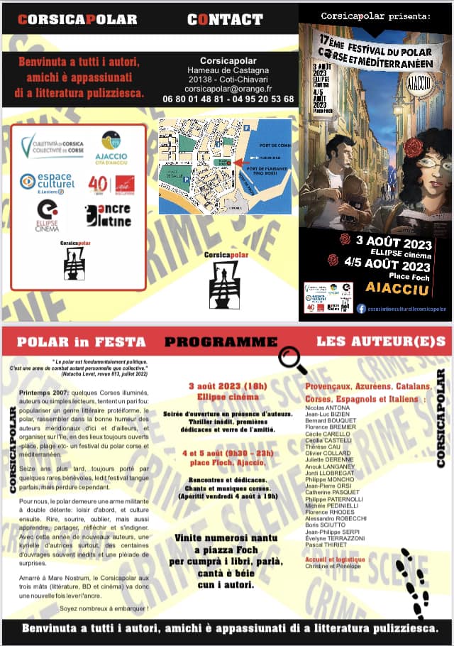 Du 3 au 5 Août Cinéma l'Ellipse / Place Foch - Aiacciu Le dix-septième festival du polar corse et méditerranéen se déroulera à Ajaccio les 3, 4 et 5 août prochains : 22 auteurs corses, continentaux, espagnols et italiens, et beaucoup de nouveautés. - 3 août : ouverture du festival à Ellipse cinéma. - 4 et 5 août : animations, rencontres et dédicaces place Foch. 3 août 2023 (18h) Ellipse cinéma Soirée d'ouverture en présence d’auteurs. Thriller inédit, premières dédicaces et verre de l’amitié. 4 et 5 août (9h30 – 23h) place Floch, Ajaccio, Rencontres et dédicaces. Chants et musiques corses. (Apéritif vendredi 4 août à 19h) Plus d'infos en téléchargement ou sur le site. |