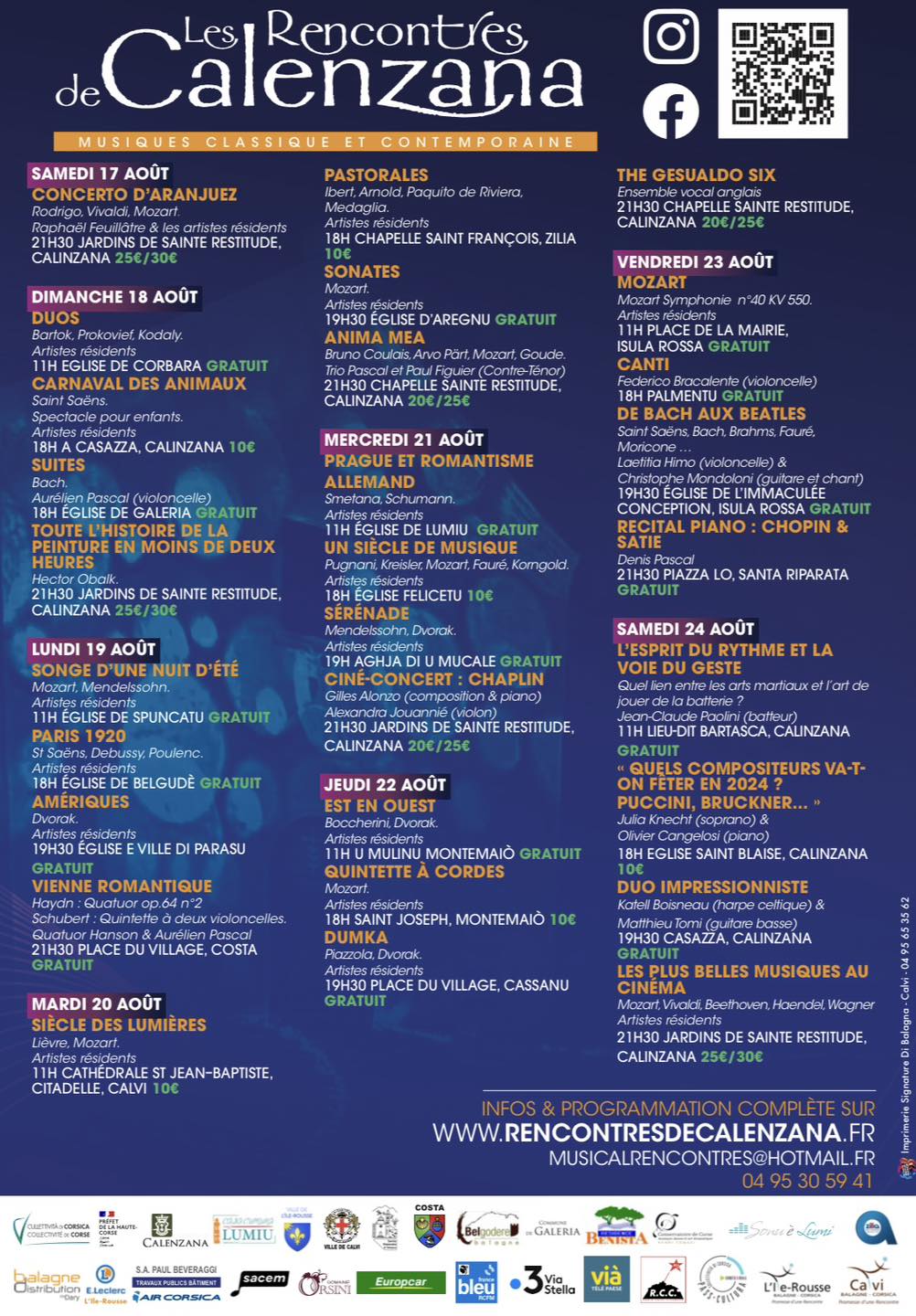 Du 17 au 24 Août Calinzana / Santa Riparata di Balagna / L'Isula / Palmentu / Cassanu / Montemaiò / U Mucale / Belgudè / Calvi / Zilia / Aregnu / Lumiu ... Depuis 24 ans, Les Rencontres de Calenzana se sont imposées comme un point d’ancrage exceptionnel dans le paysage musical insulaire et international, proposant une expérience musicale inédite, au cœur de la nature et de lieux emblématiques du patrimoine bâti de la Balagne. Les plus grands artistes de la musique classique et les plus talentueux musiciens issus de la jeune génération s’y produisent. Dix-neuf villages et vingt-trois lieux différents unissent leur désir, imagination, curiosité et plaisir pour la musique et vous donnent le meilleur et les plus originales des propositions du moment. Découvrez le programme en téléchargement. Plus d'infos sur le site. |