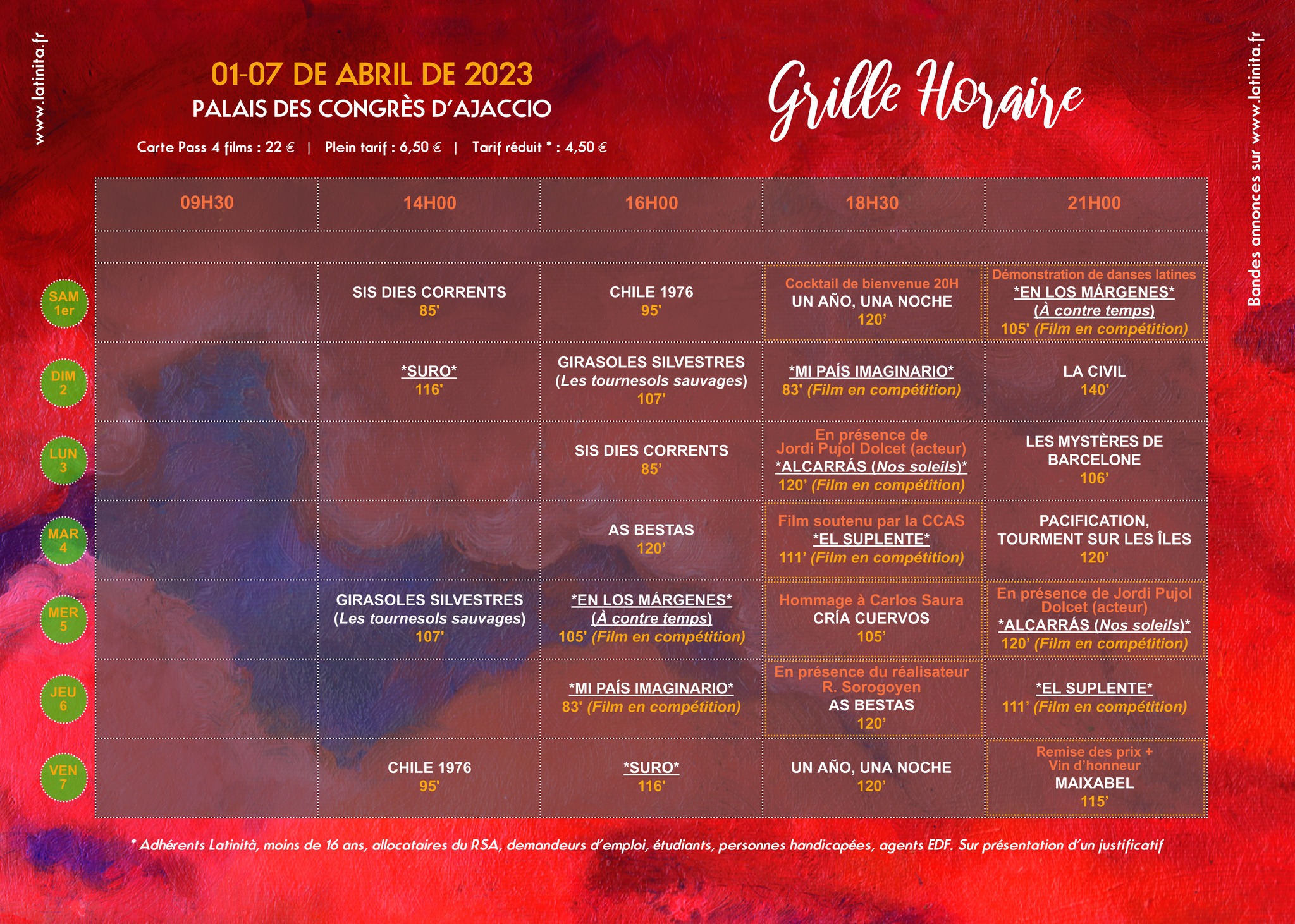 Plus de 25 ans que notre ville prend l’accent espagnol et celui de ses communautés aux infinies nuances, se délecte des parfums et des saveurs venues de la péninsule ibérique et de tous les pays latino-américains, découvre la richesse et la diversité de leurs cultures mêlant passé et présent et s’imprègne de leurs réalités, de leurs rêves, de leurs espoirs… Le Festival du Cinéma Espagnol et Latino-américain, à travers la projection de films du programme soigneusement sélectionnés, invite le public ajaccien et de la région, à partager des émotions que la « nouvelle vague » déferlante de cinéastes de talent fait naître en nous et de façon plus intense encore, dans une salle obscure, sur grand écran, au Palais des Congrès. Des films originaux, des premiers films, des films de femmes, des films d'auteur, des films primés dans les plus grands festivals, des films inédits qui traitent de thèmes qui nous touchent, nous détendent, nous donnent à réfléchir ou bien nous permettent d'ouvrir une fenêtre sur la Catalogne afin de nous rapprocher davantage de la culture de nos voisins. LES FILMS 16 films Long-métrages, documentaire, film d’animation. 4 nationalités : Espagne, Mexique, Argentine, Chili. 5 films en compétition : Alcarrás, Suro, En los márgenes, El suplente, Mi país imaginario. 5 sections : - Finestra catalana : films produits ou coproduits en Catalogne, - Retour vers la terre, - Chroniques politico-sociales, - Films de femmes, - Premiers films, - Sélection réservée aux scolaires, - Hommage à Carlos Saura décédé la veille de la cérémonie des Goya. INVITÉS Rodrigo SOROGOYEN : réalisateur du film « As bestas », le film le plus primé aux Goya (Césars espagnols). Jordi PUJOL DOLCET, acteur principal du film multiprimé (dont Ours d’Or à Berlin en 2022) de Carla Simón, Alcarrás Lluis VALENTÌ, directeur du Festival International de Girona (Catalogne)… D’autres invitations restent à confirmer… Personnalités constituant le jury « Pro » : Marie-Jo ARRIGHI, journaliste à France 3 Corse Via Stella, Marie-Flora SAMMARCELLI, secrétaire du Festival de Lama, Kristina LARSEN, productrice de cinéma, Hippolyte GIRARDOT, acteur, scénariste et réalisateur, Jean-Guy VÉRAN, ingénieur du son, montage. MOMENTS FORTS 2 moments forts traditionnels mis en place par notre association dans le but de favoriser les échanges et le partage au « Chiringuito » : espace convivial et animé… Le cocktail d’ouverture du festival et le vin de l’amitié pour sa clôture. La rencontre du mercredi : pour apprendre à se connaître, les membres de l’association et des 3 jurys se retrouvent autour d’un verre de sangría et d’une assiette de tapas. La proclamation des résultats du vote des jurys : Le jury « Pro » décerne le « Grand Prix », Le jury des Étudiants attribue « Le prix des Étudiants », Le jury de la CCAS accorde le prix « Hasta Siempre », Les « festivaliers » désignent le film qui mérite «le prix du Public ». DÉMONSTRATION DE DANSES LATINAS L’école de danse « Artistella » fera une démonstration de danses latinas : salsa, tango, bachata, rumba… pour créer des moments « alegres y calientes… » afin de plonger le public dans le vif du sujet ! LES PARTENAIRES INSTITUTIONNELS ET PRIVÉS L’organisation d’une telle manifestation exige un investissement important de la part des membres de l’association. Nous avons réussi à créer une équipe très soudée et très motivée. Outre notre amour du cinéma, ce sont les réactions, les compliments et les encouragements du public qui nous accompagnent tout au long des multiples activités qui composent le « montage » de ce festival. Mais nous ne sommes pas les seuls impliqués… En effet, nos partenaires institutionnels (CDC, Mairie d’Ajaccio, CCAS) et privés fidèles et nombreux, sont tout autant actifs : nous ne pourrions pas mener à bien ce magnifique projet sans leur contribution. PROJET DE RAPPROCHEMENT CORSE-CATALOGNE, D’UNA RIBA À L’ALTRA C’est avec beaucoup d’enthousiasme que les membres de Latinità ont répondu présents à la démarche entreprise par l’association Corsica-Catalunya, D’una Riba à l’altra, qui a pour objectif de renforcer les liens qui unissent nos deux régions dans les domaines de l’art et de la culture. Lors de la 24ème édition du Festival du Cinéma Espagnol et Latino-américain, au mois de mars 2022, nous avons eu l’opportunité de poser la première pierre, à un édifice promis à des projets très enrichissants et pleins de promesses d’échanges et de rencontres... Découvrez la grille horaire en téléchargement. Plus d'infos sur le site. |