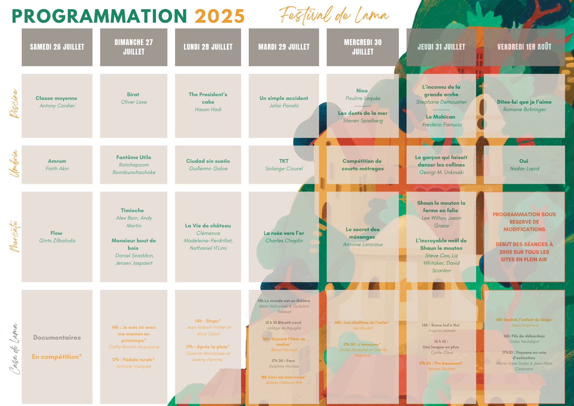 Du samedi 26 juillet au vendredi 1er août Lama Du 26 juillet au 1er août vivez une semaine de cinéma en plein cœur du village de Lama! Projections, rencontres avec les réalisateurs, animations pour les grands et les petits… une programmation riche et engagée vous attend. *Affiche réalisée par Elisa Mavier-Cagninacci Programme en téléchargement Plus d'infos sur le site. |