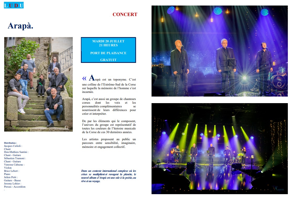 Mardi 20 Juillet - 21H Port de plaisance - Propriano Concert gratuit. Plus d'infos sur le site et en téléchargement. |
