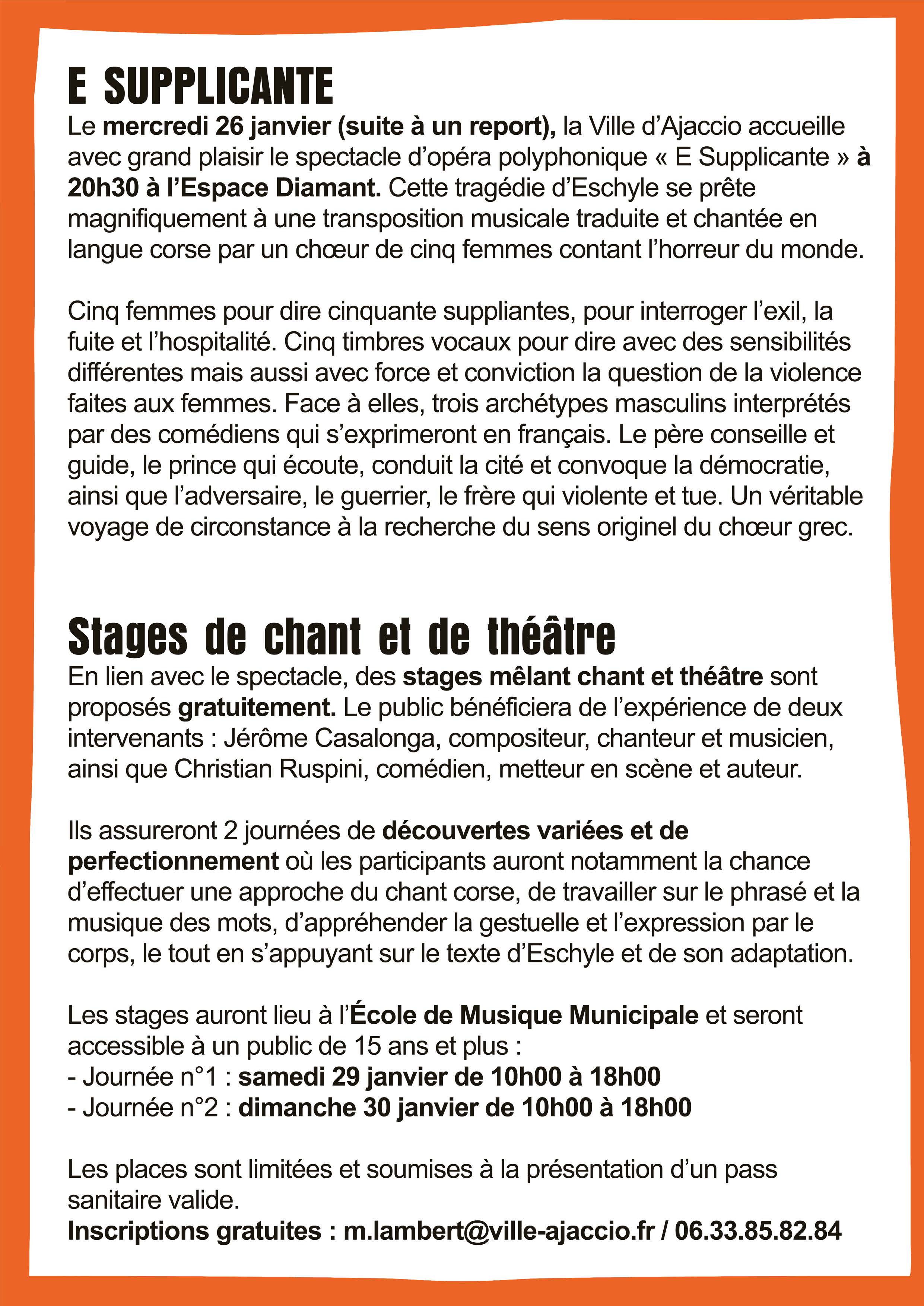 Stages de chant, polyphonie et théâtre Accessible à partir de 15 ans à l'école de musique municipale > Journée 1 - Samedi 29 Janvier - 10h/18h > Journée 2 - Dimanche 30 Janvier - 10h/18h Inscriptions gratuites par mail : m.lambert@ville-ajaccio.fr ou par téléphone 06 33 85 82 84 Plus d'infos en télécharment. |