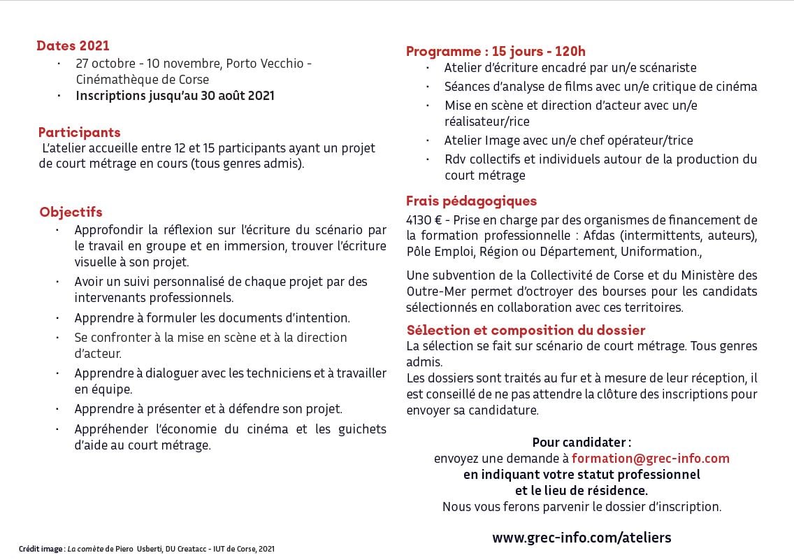 Du 27 Octobre au 10 Novembre à Porto-Vecchio Le Grec mène des ateliers depuis 15 ans dans le but de soutenir la jeune création cinématographique et d'accompagner des jeunes réalisateurs dans l'écriture de leur scénario de court métrage. Les ateliers sont organisés en partenariat avec les Cinémathèques de Grenoble, la Cinémathèque française, de Martigues et de Porto-Vecchio. Le Grec est Datadocké. Atelier-résidence Perfectionnement de l'écriture - film court : Cet atelier-résidence de 15 jours rassemble entre 12 et 15 auteurs-réalisateurs qui bénéficient d'heures de travail individuel et en groupe dirigé par des professionnels (scénaristes, critiques de cinéma, réalisateurs, directeurs de la photographie, producteurs...). OBJECTIFS Approfondir la réflexion sur l’écriture du scénario par le travail en groupe et en immersion, trouver l’écriture cinématographique de son projet. Avoir un suivi personnalisé de chaque projet par des intervenants professionnels. Apprendre à formuler les documents d’intention. Se confronter à la mise en scène et à la direction d’acteur. Apprendre à dialoguer avec les techniciens et à travailler en équipe. Apprendre à présenter et à défendre son projet. Appréhender l’économie du cinéma et les guichets d’aide au court métrage. Inscriptions jusqu'au 30 Août 2021 Plus d’infos en téléchargement et sur le site. |
