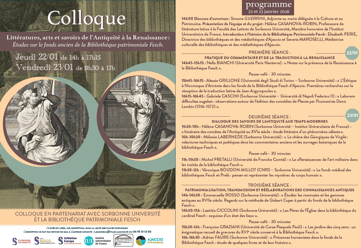 Jeudi 22 janvier à partir de 14h30 et vendredi 23 janvier à partir de 09h30 Bibliothèque Fesch - Aiacciu Plongez au cœur des trésors de notre fonds ancien ! La Bibliothèque patrimoniale Fesch, en partenariat avec Sorbonne Université, vous invite à un colloque exceptionnel : « Littératures, arts et savoirs de l'Antiquité à la Renaissance » Un moment d'étude unique sur la richesse de nos collections patrimoniales. Entrée libre sur inscription (dans la limite des places disponibles). Renseignements et inscriptions : 04 95 51 13 00 / s.maroselli@ville-ajaccio.fr Découvrez le programme en téléchargement. Plus d'infos sur le site. |