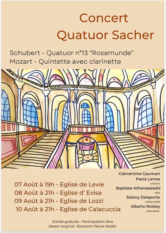 Shubert - Quatuor n°13 "Rosamunde" Mozart - Quintette avec clarinette Dimanche 7 Août - 19H Église - Levie Lundi 8 Août - 21H Église d'Evisa Mardi 9 Août - 21H Église de Lozzi Mercredi 10 Août - 21H Église de Calacuccia Entrée gratuite - Participation libre Plus d'infos en téléchargement. |