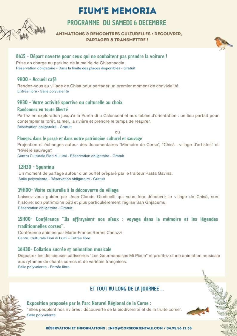 Samedi 6 décembre à 15h Centru Culturali Fiori di Lumi - Chisà 15H00- Conference "Ils effrayaient nos aïeux : voyage dans la memoire et les legendes traditionnelles corses" Conférence animée par Marie-France Bereni Centru Culturale Fiori di Lumi - Entrée libre. Plus d'infos sur le site. |