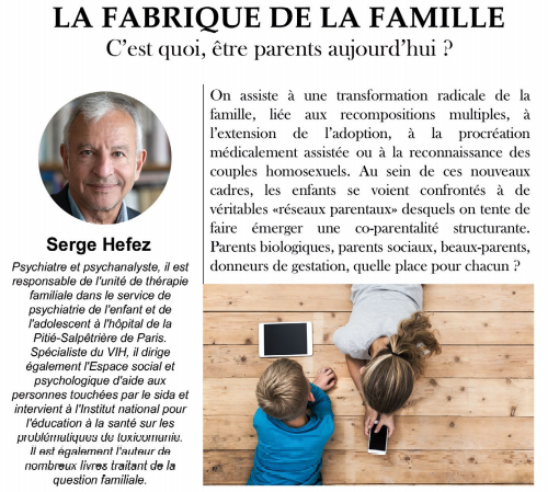 LA FABRIQUE DE LA FAMILLE par Serge Hefez (Psychiatre et psychanalyste) 23/10/2021- 15H - Parc Galea Plus d'infos en téléchargement et sur le site. |