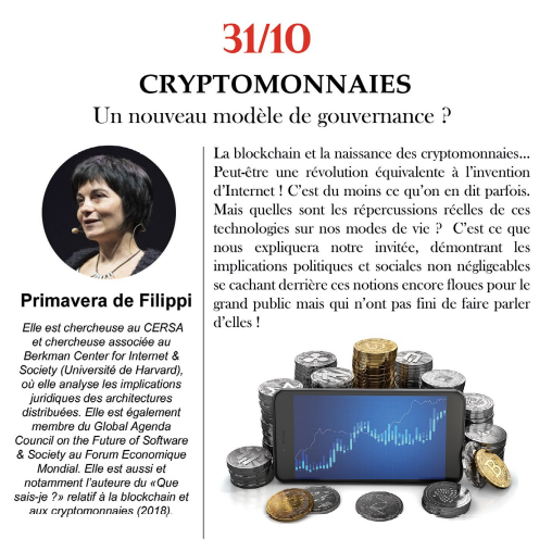 LES CRYPTOMONNAIES par Primavera de Filippi (Chercheuse) 31/10/2021- 15H - Parc Galea Plus d'infos en téléchargement et sur le site. |