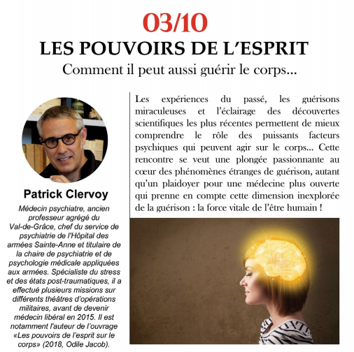 LES POUVOIRS DE L'ESPRIT SUR LE CORPS par Patrick Clervoy (Psychiatre) 03/10/2021- 15H - Parc Galea Plus d'infos en téléchargement et sur le site. |