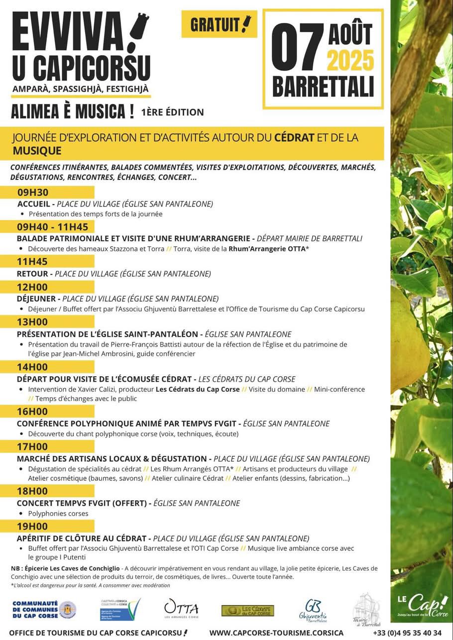 Jeudi 7 août à partir de 9h30 Barrettali Journée d'exploration et d'activités autour du cédrat et de la musique : conférences itinérantes, balades commentées, visites d'exploitations, découvertes, marchés, dégustations, rencontres, échanges, concert... Temps forts de la journée : 9h40 → Balade patrimoniale et visite 13h00 → Présentation de l’église San Pantaleone par Pierre-François Battisti et Jean-Michel Ambrosini, son patrimoine et ses travaux de réfection. 14h00 → Visite de l’Écomusée du Cédrat avec Xavier Calizi, producteur. 16h00 → Conférence sur le chant polyphonique animée par Tempvs Fvgit - Église 18h00 → Concert de polyphonies corses par Tempvs Fvgit (offert) - Église Découvrez tout le programme détaillé en téléchargement. Plus d'infos sur le site. |