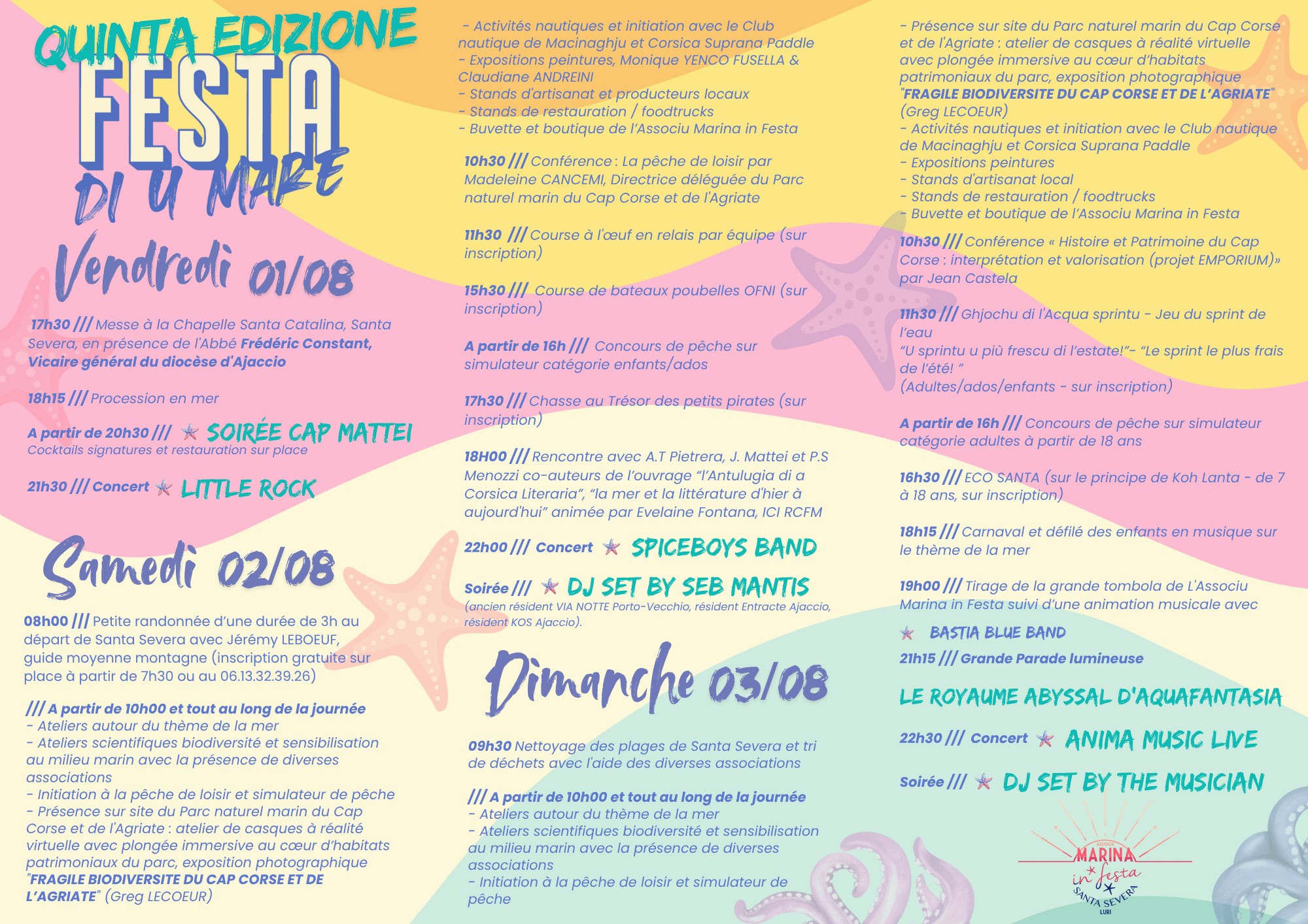 Du 1er au 3 août Marine de Santa-Severa - Luri L'Associu Marina in Festa vous donne rendez-vous pour la 5ème édition de la Festa di u Mare les 1 et 3 août 2025 ! A FESTA DI U MARE est une manifestation autour du thème de la mer qui a lieu tous les ans à SANTA SEVERA, MARINE DE LURI. Trois jours de fête, de traditions, d'échanges et de rencontres au bord de la mer ... Au programme : Animations culturelles et musicales Dégustations de produits locaux Ateliers et activités pour tous les âges Et bien d’autres surprises… Une occasion unique de célébrer notre patrimoine maritime et de partager des moments inoubliables en famille ou entre amis. Décoouvrez le programme en téléchargement. Plus d'infos sur le site. |