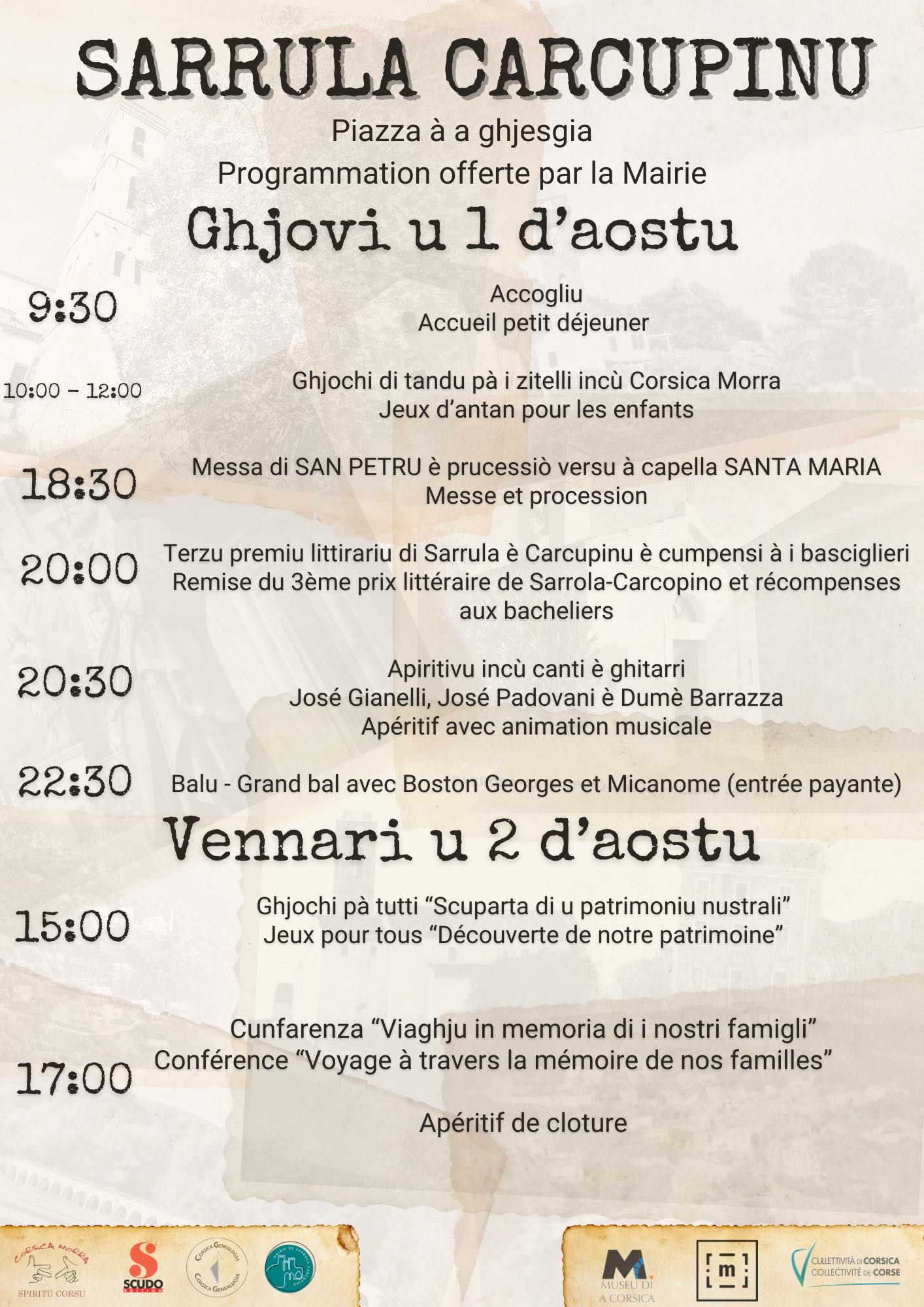 Jeudi 1er et vendredi 2 août Sarrula è Carcupinu Découvrez le programme en téléchargement. Plus d'infos sur le site. |