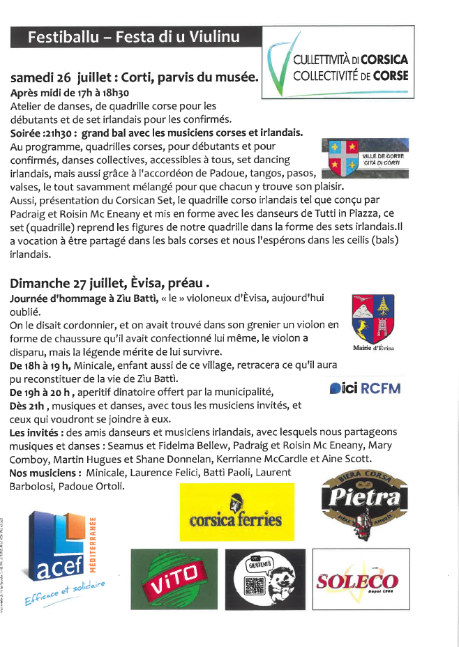 Samedi 26 juillet à partir de 17h Parvis du musée, Citadelle - Corti Festiballu - Festa di u Viulinu samedi 26 juillet : Corti, parvis du musée. Après midi de 17h à 18h30 Atelier de danses, de quadrille corse pour les débutants et de set irlandais pour les confirmés. Soirée : 21h30 : grand bal avec les musiciens corses et irlandais. Au programme, quadrilles corses, pour débutants et pour confirmés, danses collectives, accessibles à tous, set dancing irlandais, mais aussi grâce à l'accordéon de Padoue, tangos, pasos, valses, le tout savamment mélangé pour que chacun y trouve son plaisir. Aussi, présentation du Corsican Set, le quadrille corso irlandais tel que conçu par Padraig et Roisin Mc Eneany et mis en forme avec les danseurs de Tutti in Piazza, се set (quadrille) reprend les figures de notre quadrille dans la forme des sets irlandais. Il a vocation à être partagé dans les bals corses et nous l'espérons dans les ceilis (bals) irlandais. Programme en téléchargement Plus d'infos sur le site. |