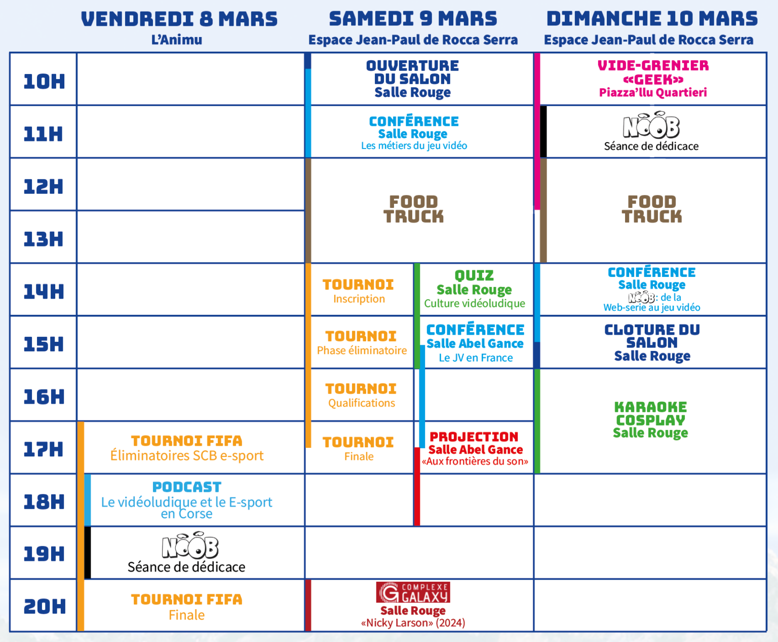 Les 1er et 2 mars Complexe sportif du Pruneddu - Portivechju La Corsica Games Week est un événement annuel, organisé par l'associu Sud Corse Rétrogaming et a Cità di Portivechju, qui célèbre l’univers du jeu vidéo sous toutes ses formes et tente de faire renouer avec cette idée de partage, d’échange, de conseil en replaçant l’humain au milieu du tout numérique, en valorisant tous les métiers de l'audiovisuel et en organisant des rencontres entre passionnés et professionnels de cet univers. La thématique de cette édition : l'Intelligence Artificielle. - Gaming Fabbrica : du 25 au 28 février, des ateliers avec des créateurs de jeu vidéo à l'Animu ! - Conférences autour de l'Intelligence Artificielle - Tournois e-sports - Concert et spectacle de drone - Défilé Cosplay - Jeux vidéo en accès libre : bornes d'arcades, réalité virtuelle, jeux musicaux et bien d'autres ! - Quiz - Hommage à Akira Toriyama - Kids Corner : un espace animé et spécialement aménagé pour les plus jeunes avec des jeux gonflables Restauration et buvette sur place Pour plus d'informations, rendez-vous sur le site officiel de l'événement : www.corsicagamesweek.fr Un événement en partenariat avec : • L'Animu • L'Associu La 20e Légion • L'Associu Ludi-K Entrée libre, tous public Plus d'infos sur le site. |