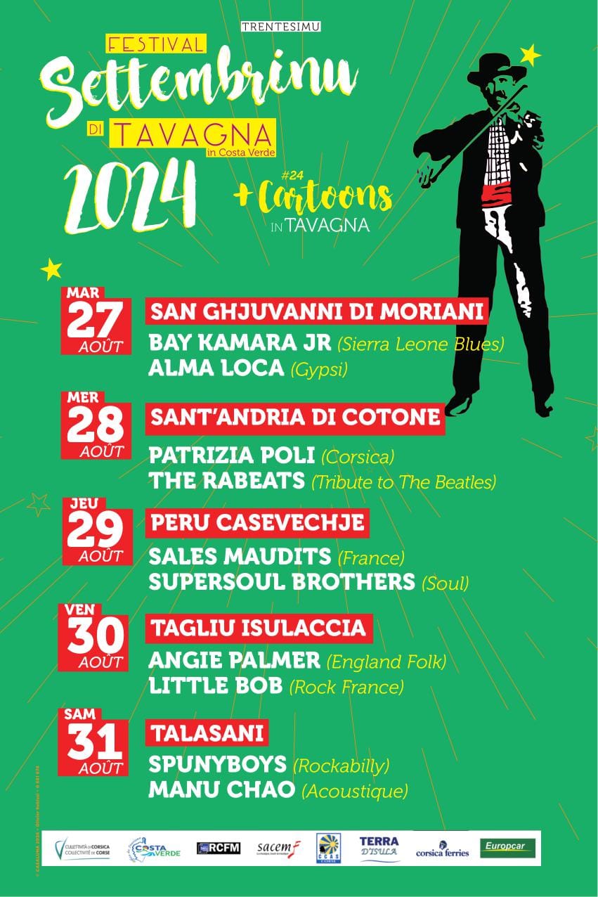 Du mardi 27 au samedi 31 août Tavagna Club Talasani / San Ghjuvanni di Moriani / Sant'andria di Cotone / Peru Casevechje / Tagliu Isulaccia Mardi 27 août - San Ghjuvanni di Moriani Bay Kamara Jr (Sierra Leone Blues) Alma Loca (Gypsi) Mercredi 28 août - Sant'andria di Cotone Patrizia Poli (Corsica) The Rabeats (Tribute To The Beatles) Jeudi 29 août - Peru Casevechje Sales Maudits (France) Supersoul Brothers (Soul) Vendredi 30 Août - Tagliu Isulaccia Angie Palmer (England Folk) Little Bob (Rock France) Samedi 31 août - Talasani Spunyboys (Rockabilly) Manu Chao (Acoustique) Découvrez la programmation en téléchargement. Plus d'infos sur le site. |