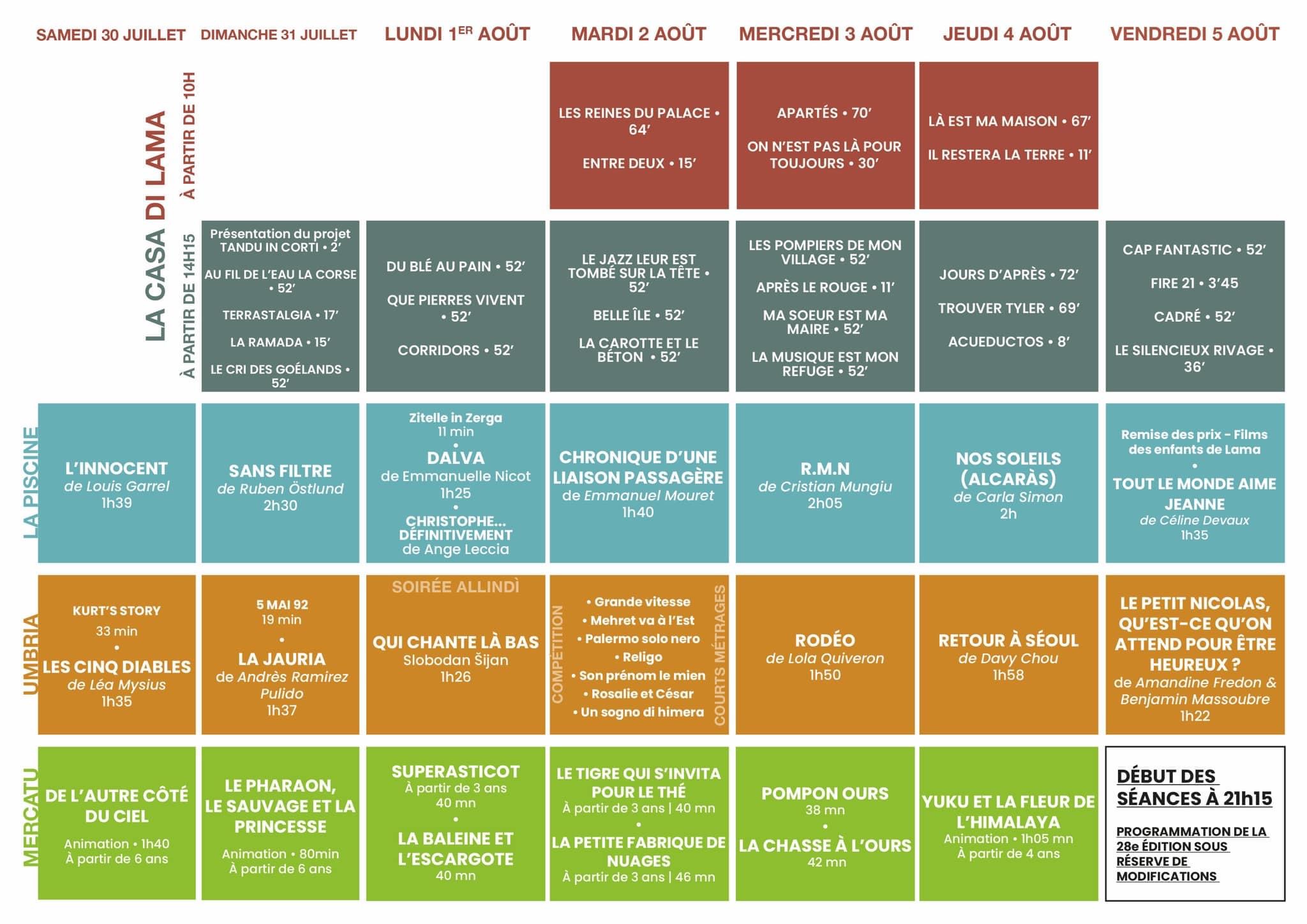 Du samedi 30 juillet au vendredi 5 août Tout comme Cannes, le village de Lama a son Festival du Film. Avec l'authenticité et la convivialité typique de la Balagne et de la Corse. Lama vous invite à fêter cette année les 28 ans de ce rendez-vous international. Cette année, le Festival du film de Lama revient en force ! La programmation sera très prochainement dévoilée... Comme toujours, le festival de Lama est tout public, avec des projections pour les enfants chaque soir, des courts-métrages, des longs-métrages en avant-première et des documentaires. Dans une ambiance familiale, des ateliers rythment les journées comme celui du « film » des enfants (écriture et réalisation d’un court métrage par les enfants du village, projeté lors de la soirée de clôture) mais également des lectures, des ateliers de chant, de danse, de scénario, etc. Après les grandes projections du soir sous les étoiles de Balagne, les équipes de film donnent rendez-vous au public le lendemain des séances, sous le platane, à 11h pour échanger et répondre aux questions. Découvrez le programme en téléchargement. Plus d’infos sur le site. |