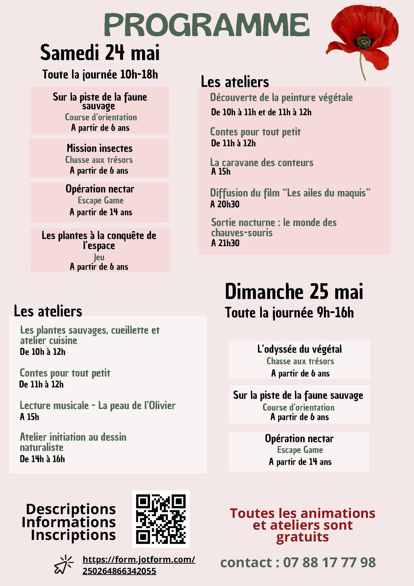 Samedi 24 et dimanche 25 mai Parc Padulella - Santu Niculaiu Le CPIE Centre Corse - A Rinascita organise, pour les 𝟮𝟰 𝗲𝘁 𝟮𝟱 𝗺𝗮𝗶 prochains, La Fête de la Nature dans le 𝗣𝗮𝗿𝗰 𝗣𝗮𝗱𝘂𝗹𝗲𝗹𝗹𝗮 𝗱𝗲 𝗠𝗼𝗿𝗶𝗮𝗻𝗶, en collaboration avec la Commune de San Nicolao et la Communauté de Communes de la Costa Verde. La manifestation est soutenue par la 𝗗𝗥𝗘𝗔𝗟 𝗖𝗼𝗿𝘀𝗲 et se déroulera dans le cadre de l’élaboration de l’𝗔𝘁𝗹𝗮𝘀 𝗱𝗲 𝗹𝗮 𝗕𝗶𝗼𝗱𝗶𝘃𝗲𝗿𝘀𝗶𝘁𝗲́ 𝗱𝗲 𝗹𝗮 𝗖𝗼𝘀𝘁𝗮 𝗩𝗲𝗿𝗱𝗲, financé en partie par l’Office français de la biodiversité. Cette édition s’inscrit dans la volonté de 𝗳𝗮𝗶𝗿𝗲 𝗱𝗲́𝗰𝗼𝘂𝘃𝗿𝗶𝗿 𝗮̀ 𝗹𝗮 𝗽𝗼𝗽𝘂𝗹𝗮𝘁𝗶𝗼𝗻 𝗹𝗮 𝗻𝗮𝘁𝘂𝗿𝗲 𝗲𝘁 𝗹𝗮 𝗯𝗶𝗼𝗱𝗶𝘃𝗲𝗿𝘀𝗶𝘁𝗲́ 𝗱𝗲 𝗺𝗮𝗻𝗶𝗲̀𝗿𝗲 𝗹𝘂𝗱𝗶𝗾𝘂𝗲, sous un angle nouveau. Des animations et ateliers 𝗴𝗿𝗮𝘁𝘂𝗶𝘁𝘀 seront proposés tout au long du week-end, à faire en famille ou entre amis. 𝗟𝗲 𝗽𝗿𝗼𝗴𝗿𝗮𝗺𝗺𝗲 est varié et adapté à tous les âges, aux grands comme aux petits : - Découverte de la faune sauvage et de son environnement - Mieux connaître les insectes lors d'une chasse aux trésors - Résoudre les énigmes d'un escape game pour en apprendre d'avantage sur les pollinisateurs - Jeux pédagogiques sur les plantes - Sortie nocturne pour découvrir le monde des chauves-souris - Reconnaître les plantes comestibles et les déguster - Apprendre à bien observer la nature pour mieux la dessiner - Utiliser le pouvoir des plantes dans un atelier teinture végétale 𝘗𝘰𝘶𝘳 𝘦𝘯 𝘴𝘢𝘷𝘰𝘪𝘳 𝘥'𝘢𝘷𝘢𝘯𝘵𝘢𝘨𝘦 𝘴𝘶𝘳 𝘭𝘦 𝘱𝘳𝘰𝘨𝘳𝘢𝘮𝘮𝘦, 𝘯𝘰𝘴 𝘱𝘢𝘳𝘵𝘦𝘯𝘢𝘪𝘳𝘦𝘴 𝘦𝘵 𝘴'𝘪𝘯𝘴𝘤𝘳𝘪𝘳𝘦 𝘢𝘶𝘹 𝘢𝘵𝘦𝘭𝘪𝘦𝘳𝘴 (𝘭𝘦𝘴 𝘱𝘭𝘢𝘤𝘦𝘴 𝘴𝘰𝘯𝘵 𝘭𝘪𝘮𝘪𝘵𝘦́𝘦𝘴 𝘱𝘰𝘶𝘳 𝘤𝘦𝘳𝘵𝘢𝘪𝘯𝘦𝘴 𝘢𝘯𝘪𝘮𝘢𝘵𝘪𝘰𝘯𝘴) > https://urlr.me/GZ52Qb 𝗣𝗹𝘂𝘀 𝗱'𝗶𝗻𝗳𝗼𝗿𝗺𝗮𝘁𝗶𝗼𝗻𝘀 : 07 88 17 77 98 / vfoubert@cpie-centrecorse.fr Découvrez le programme en téléchargement. Plus d'infos sur le site. |